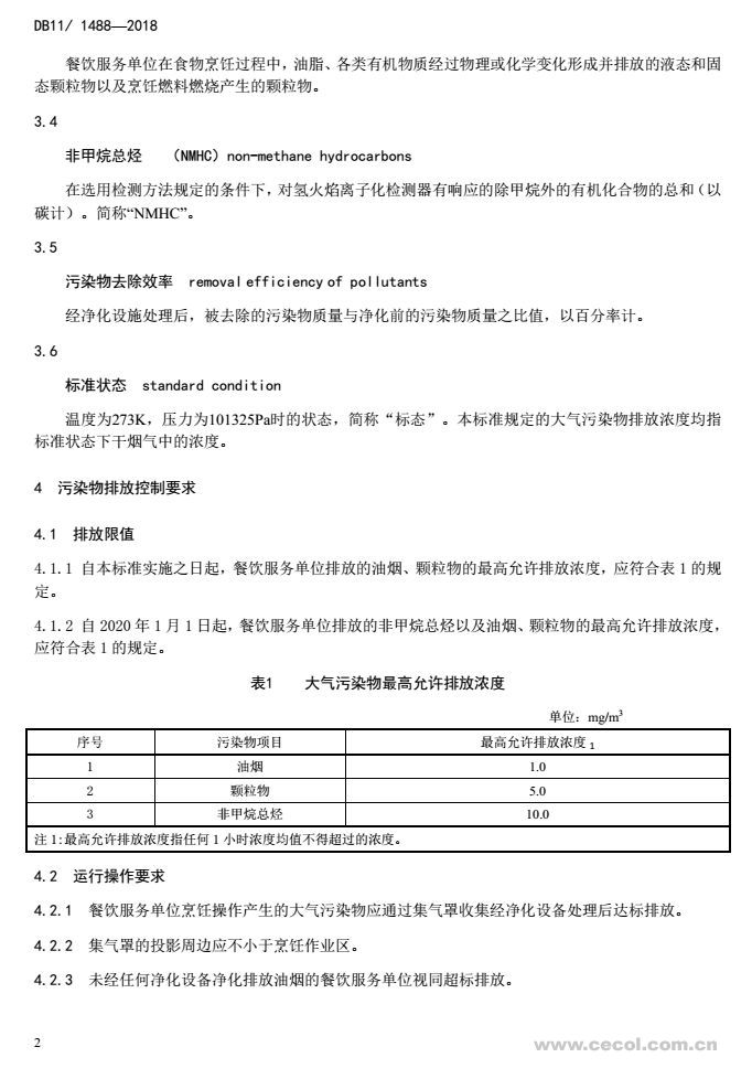 標(biāo)準(zhǔn)規(guī)定了餐飲服務(wù)單位排放的油煙、顆粒物和非甲烷總烴(注:“非甲烷總烴”為表征揮發(fā)性有機(jī)物,簡(jiǎn)稱“VOCs”的指標(biāo))三項(xiàng)污染物的排放限值,明確了三項(xiàng)污染物的監(jiān)測(cè)要求和分析測(cè)定方法,提出了凈化設(shè)備的運(yùn)行操作要求,從而全面控制餐飲業(yè)的大氣污染排放。該標(biāo)準(zhǔn)于2018年1月8日發(fā)布,并將于2019年1月1日起實(shí)施,其中油煙和顆粒物限值自標(biāo)準(zhǔn)實(shí)施之日起執(zhí)行,非甲烷總烴限值自2020年1月1日起執(zhí)行。